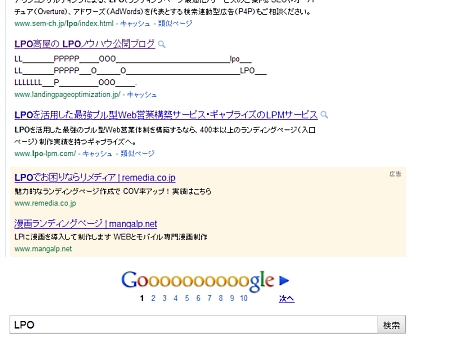 ディスクリプションのテクニック 「SEO」で検索するのは飽きたので、「LPO」というキーワードで検索してみました。クルクルと画面を下にいくとついクリックしてしまいました。このディスクリプションは・・・。検索したユーザーにクリックさせなければ始まらないのがWEBサイトですが、たしかにこれはなかなか考えた手法だな、と。ただ、クライアントさんには勧めにくいかもしれない。ところで、全日本LPO協会ってのもあるみたいですね・・・。社団法人って株式会社っぽい。 http://seolavo.blog.shinobi.jp/Entry/27/ディスクリプションのテクニック